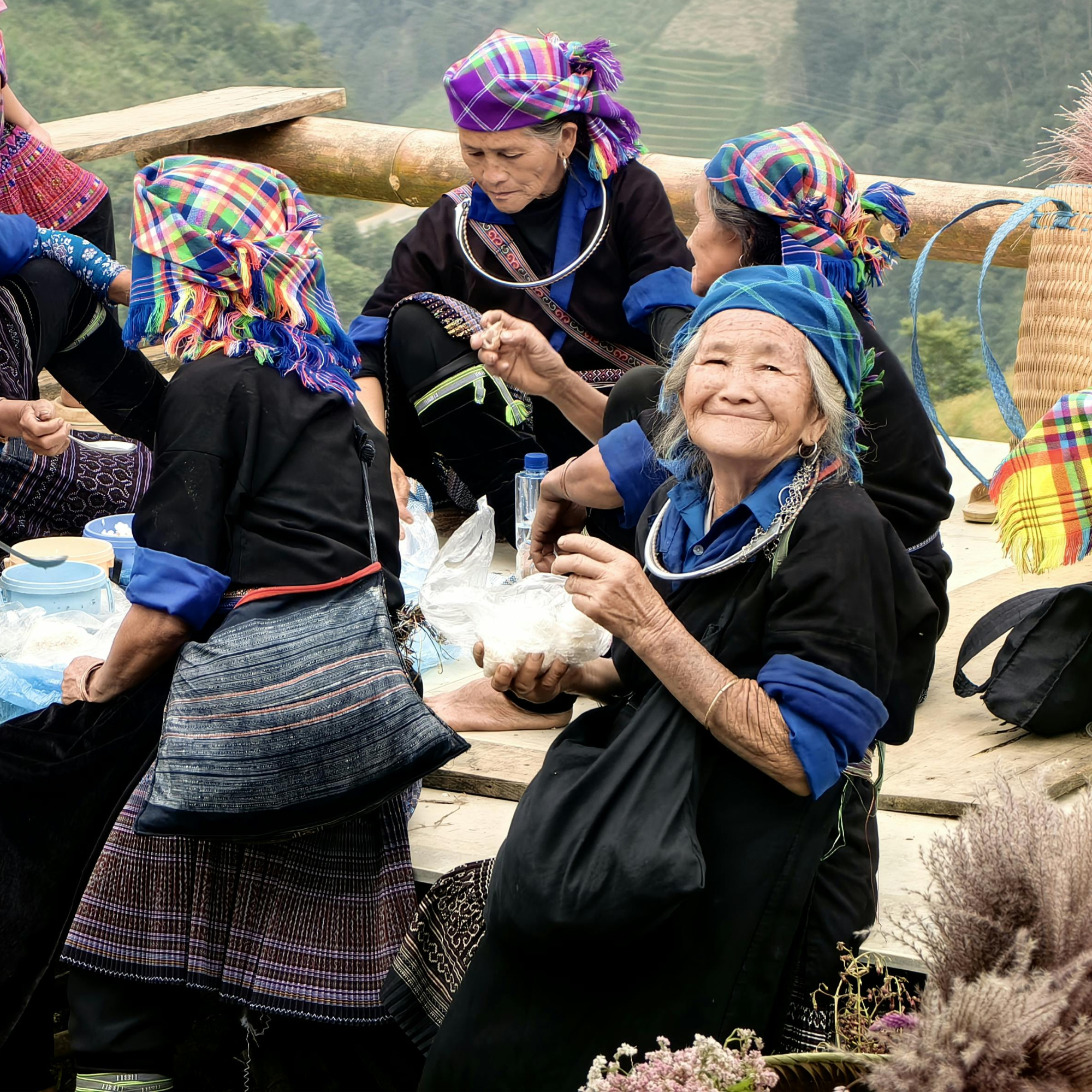 Tras el rigor de las líneas se esconde una poesía silenciosa, transmitida de madre a hija. El punto de cruz no es solo un adorno: es memoria, identidad y protección. Los colores vivos —rojo intenso, rosa vibrante, verde luminoso— se despliegan como canciones, contrastando con el índigo y el negro, reflejos de la noche de la montaña.